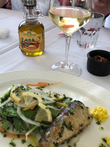 テラスでローヌ川の川風を感じながらの魚料理、ワインは対岸の畑で造られるの白ワイン★